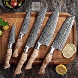 Forged Damascus Chef Set of 5 pieces Chef Knife set Kitchen Chef Knife Set Burl Olives wood handle